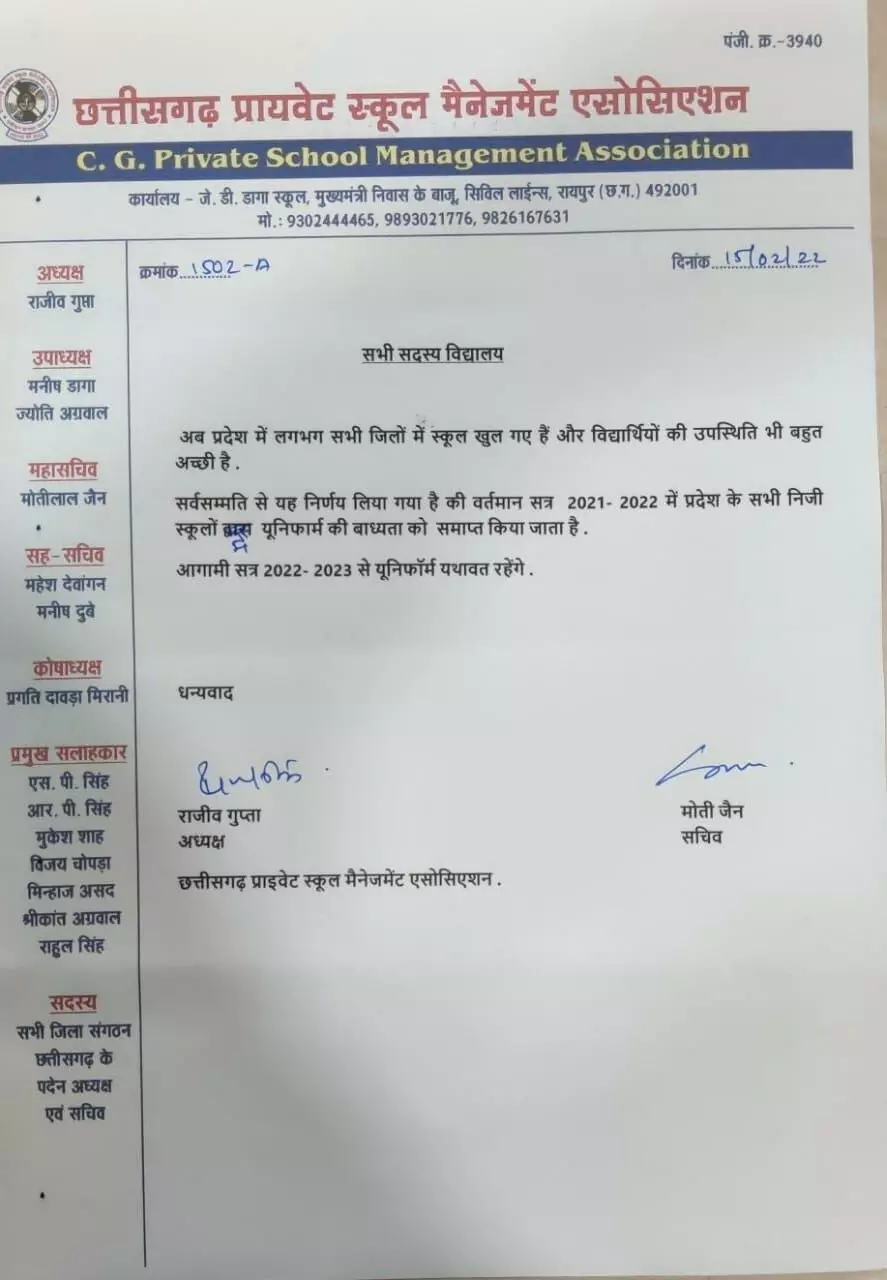 देशभर में हिजाब विवाद और ड्रेस कोड को लेकर बहस छिड़ा हुआ है. इस बीच छत्तीसगढ़ प्राइवेट स्कूल मैनेजमेंट एसोसिएशन ने ड्रेस कोड को लेकर एक अहम फैसला लिया है. छत्तीसगढ़ के प्राइवेट स्कूलों में यूनिफ़ॉर्म की बाध्यता को समाप्त कर दिया गया है. स्कूलों में इस सत्र के लिए विद्यार्थियों के लिए ड्रेस कोड लागू नहीं होगा.