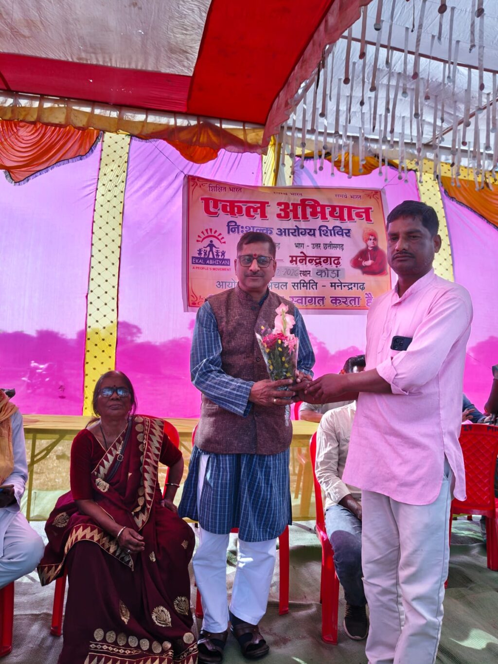 मनेंद्रगढ़:- एकल अभियान अंचल मनेंद्रगढ़ संच मनेंद्रगढ़ के विद्यालय ग्राम कोड़ा के साप्ताहिक बाजार में रविवार 8 फरवरी को स्वास्थ्य विभाग मनेंद्रगढ़ के मुख्य चिकित्सा एवं स्वास्थ्य अधिकारी डॉ अविनाश खरे सिविल अस्पताल के अधीक्षक डॉ स्वनिल तिवारी के सहयोग से निशुल्क आरोग्य शिविर का आयोजन किया गया, जिसमें एलोपैथी,और आयुष के विशेषज्ञ चिकिसको ने अपनी सेवाएं दी, जिसमें ग्राम वासियों ने बढ़ चढ़कर हिस्सा लिया और 203 लोगों ने अपना उपचार कराया, शिविर स्थल में ही रक्त परीक्षण, नेत्र परीक्षण , चश्मा जांच भी हुआ, शिविर में मुख्य रूप से उपस्थित डॉक्टर भाषिता साहू नेत्र विशेषज्ञ, डॉ देव दंत चिकित्सक, डॉ राकेश सिंह मेडिसिन विशेषज्ञ, डॉ इंतजार ओरके अस्थि रोग विशेषज्ञ, आयुष के डॉ मेघा गुप्ता डॉ मानसी , श्री आर .डी.दीवान, गेंद सिंह कंवर, अश्वनी अग्रवाल* ने अपनी सेवाएं दी ।