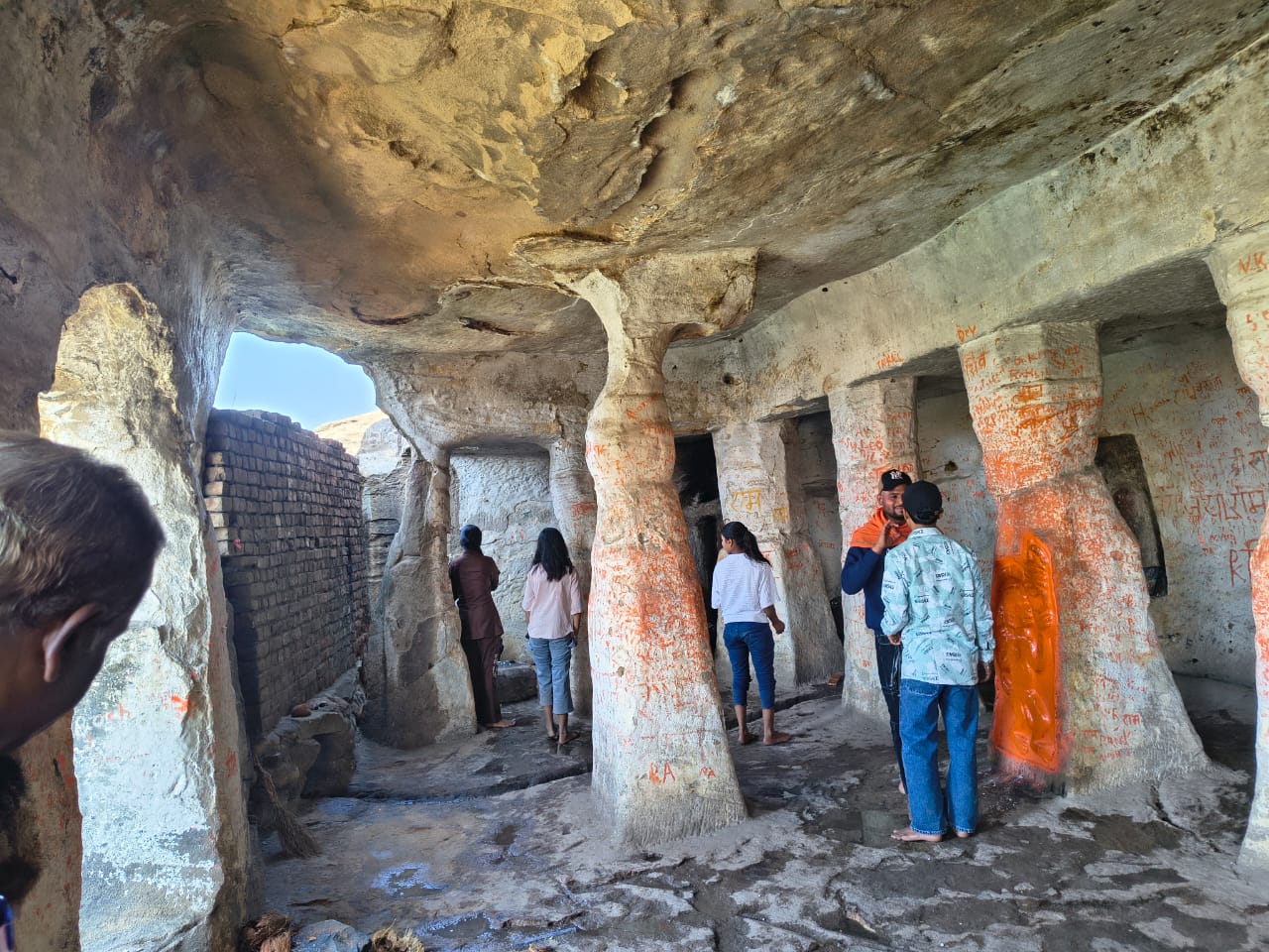 इन गुफाओं से आगे बढ़ने पर उत्तर दिशा में जमीन की सतह से लगभग 15 फीट की ऊंचाई पर प्रारंभ में पांच स्तंभ सहित कुल सोलह स्तंभ पर टिकी गुफाएं आपको आकर्षित करती हैं। पत्थरों को काटकर वर्तमान भवन निर्माण तकनीक बीम एवं कालम की संरचना पत्थरों को काटकर बनाई गई है। कुछ स्थानों पर यह स्तंभ क्षतिग्रस्त हो गए हैं जिनमें ऊपरी हिस्सा टूट जाने के कारण ईंट से इसे जोड़कर संवारने और ऊपरी छत को मजबूती देने का प्रयास किया गया है। ऊंचाई पर चढ़ते हुए एक स्वास्तिक का निशान बाहरी दीवार पर दिखाई पड़ता है जिसके ऊपर ब्राह्मी लिपि मैं पांच पंक्तियों उत्कीर्ण कर लिखी गई है। पाली भाषा में लिखी इन पंक्तियों का अर्थ सामिदते राज करयंतम्हि, सिवानंदि पंतिकेन, शिवदत्त नतिकेन, शिवमित पुतेन, बछेन मोगलि पुतेन, मूलदेवेन आराम च वन रोपापिता है। इसका अर्थ स्वामी दत्त के राज के दौरान शिवानंदी के परनाती, शिवदत्त के नाती एवं शिवमित के पुत्र वत्स गोत्र वाले मोगली के पुत्र मूल देव के द्वारा यह आराम बगीचा और वन का रोपण करवाया गया। शिलालेख के यह वाक्य गुफाओं को बनाने वाले राजा एवं कलाकार के सहयोग को प्रदर्शित करता है। इसके अनुसार यह गुफाएं एवं शिलालेख लगभग 2000 वर्ष पुरानी प्रतीत होती है। इन गुफाओं के भीतर अलग-अलग कई खंड में गुफाएं बनी हुई है जहां पर शिवलिंग, हनुमान जी एवं देवियों की मूर्तियां उकेरी गई है। देवी प्रतिमा के संबंध में यह जानकारी मिलती है कि यह मूर्तियां 11वीं सती की है जिनमें से कुछ मूर्तियां टूट चुकी है। बाहर की पूर्वी दीवारों पर यश जैसे विशाल आकृतियां उकेरी गई है। अंदर की गुफाओं में ढाई फीट चौड़े एवं लगभग 8 फुट लंबे पत्थर की संरचना बनाई गई है, जो संभवत विश्राम के लिए उपयोग किए जाते थे। अलग-अलग शोध प्रबंध में बड़ी गुफा को दुर्वासा गुफा, तथा देवी मंदिरों की गुफाओ सीतामढ़ी गुफा का नाम दिया गया है।अलग-अलग स्थान पर प्राप्त शैल चित्र ब्राह्मी लिपि के साथ कई स्थानों पर शंख लिपि में भी उत्कीर्ण किए गए हैं। ब्राह्मी लिपि पढ़ी जा सकती है किंतु शंख लिपि अब तक किसी भी विद्वान द्वारा पढ़ी नहीं जा सकी है इसलिए पत्थरों पर उत्कीर्ण शंख लिपि के बारे में कोई प्रमाणिक जानकारी उपलब्ध नहीं है।