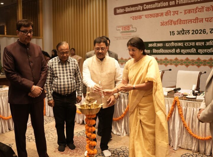 रायपुर, (छ.ग.):-छत्तीसगढ़ राज्य बाल अधिकार संरक्षण आयोग, रायपुर द्वारा “रक्षक (RAKSHAK) पाठ्यक्रम” को राज्य में प्रभावी रूप से लागू करने की दिशा में सतत प्रयास किए जा रहे हैं। “रक्षक” पाठ्यक्रम एक विशेष शैक्षणिक पहल है, जिसका उद्देश्य महाविद्यालयीन विद्यार्थियों के माध्यम से बाल अधिकारों के प्रति जागरूकता बढ़ाना, बच्चों की सुरक्षा सुनिश्चित करना तथा समाज में बाल संरक्षण के प्रति संवेदनशीलता विकसित करना है। इस पाठ्यक्रम के क्रियान्वयन हेतु पूर्व में मुख्यमंत्री श्री विष्णुदेव साय जी की उपस्थिति में महिला एवं बाल विकास मंत्री श्रीमती लक्ष्मी रजवाड़े जी तथा उच्च शिक्षा मंत्री श्री टंक राम वर्मा जी के सहयोग से एमओयू संपन्न किया गया था। यह एमओयू राज्य के उच्च शिक्षण संस्थानों में “रक्षक” पाठ्यक्रम को लागू करने की दिशा में एक महत्वपूर्ण कदम रहा है, जिससे विद्यार्थियों को बाल अधिकारों और सुरक्षा संबंधी विषयों में प्रशिक्षित किया जा सके। इसी क्रम में आज दिनांक 15 अप्रैल 2026 को रायपुर स्थित होटल बेबिलोन में “रक्षक” पाठ्यक्रम के अंतर्गत तैयार उप-इकाइयों (सब-यूनिट्स) को अंतिम रूप प्रदान करने हेतु विश्वविद्यालयीन परामर्श बैठक का आयोजन किया गया।