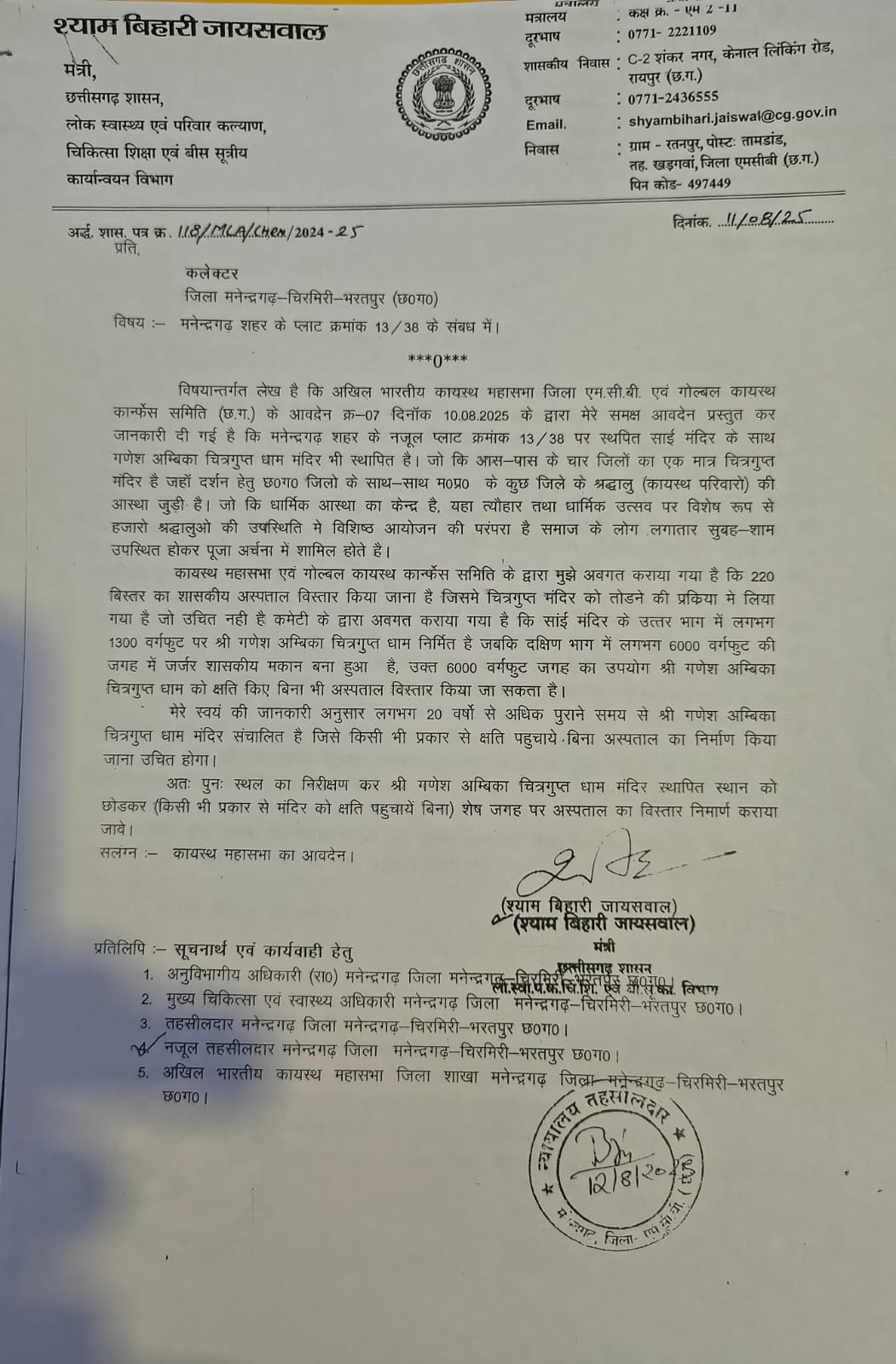 एमसीबी।जिले में स्थित चित्रगुप्त मंदिर को हटाने की संभावित कार्रवाई को लेकर विवाद गहराता जा रहा है। प्रशासन द्वारा अस्पताल के विस्तार के नाम पर मंदिर को तोड़ने की तैयारी किए जाने के आरोपों ने स्थानीय लोगों और चित्रांश समाज में आक्रोश पैदा कर दिया है। समाज के लोगों का कहना है कि यह केवल विकास का मुद्दा नहीं, बल्कि आस्था पर सीधा प्रहार है।