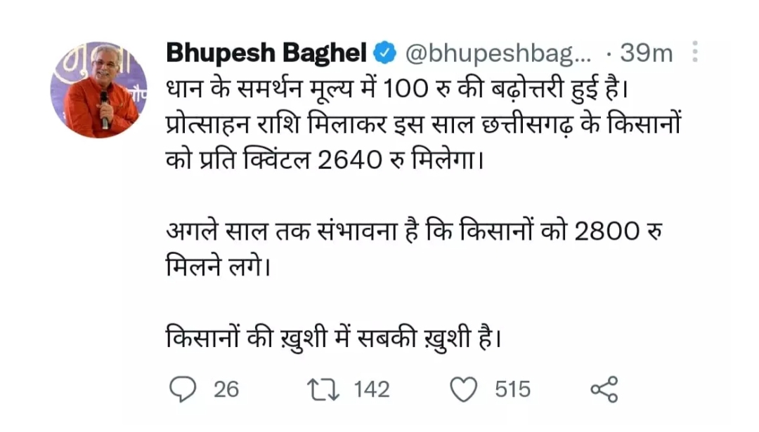 रायपुर, 09 जून 2022। मुख्यमंत्री भूपेश बघेल ने किसानों के लिए एक बड़ी खबर दी है। सीएम ने ट्वीट कर जानकारी दी है कि अगले साल तक किसानों को 2800 रुपए मिलने की संभावना है