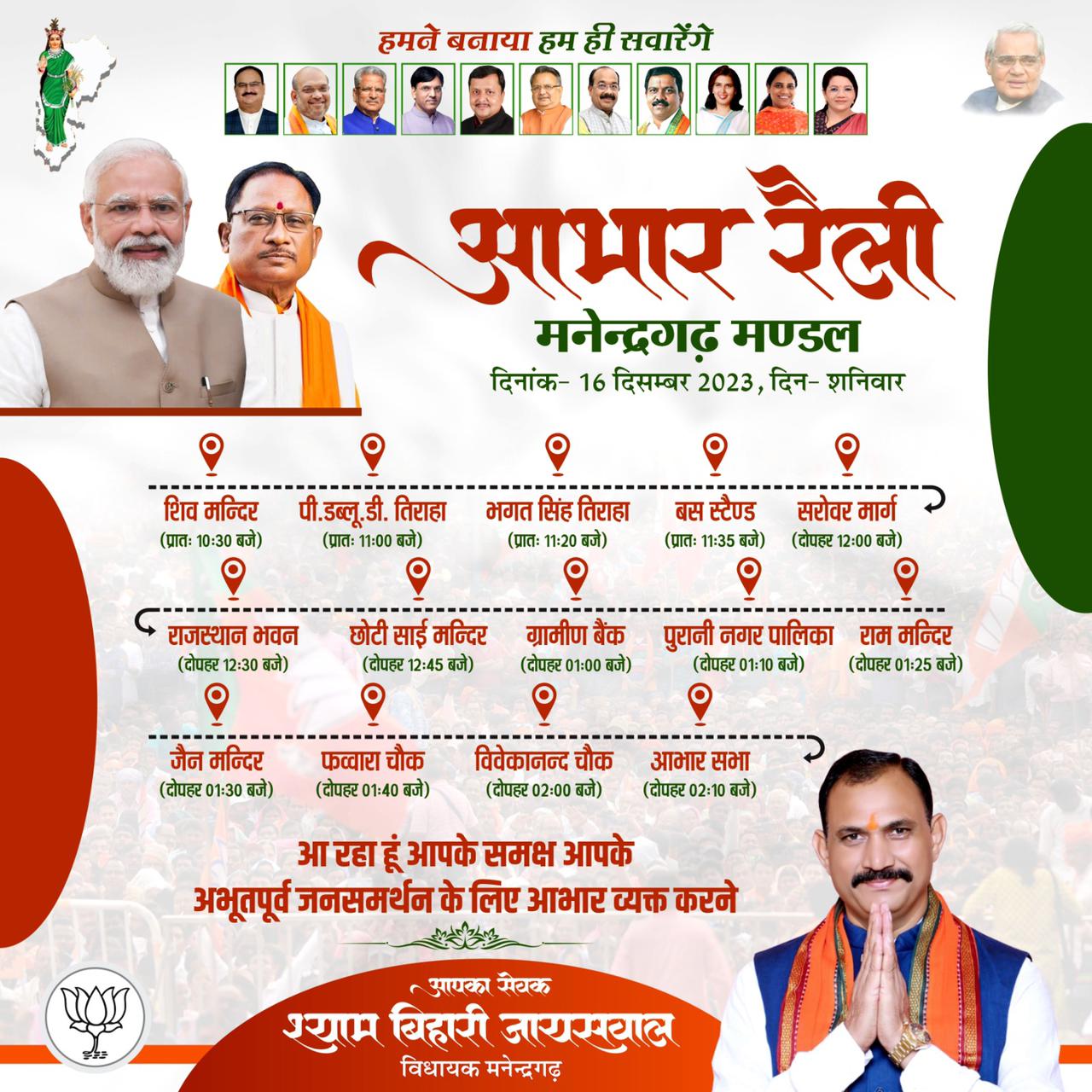 मुख्यमंत्री उप मुख्यमंत्रियों के शपथ ग्रहण समारोह के बाद लौटते ही क्षेत्र की जनता का आभार व्यक्त करने मनेन्द्रगढ़ विधायक ने निकाली आभार रैली।