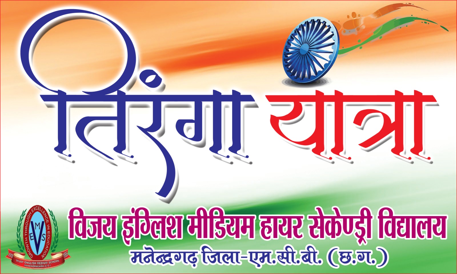 मनेन्द्रगढ़:- नगर के विद्यालय विजय इंग्लिश मीडियम स्कूल द्वारा तिरंगा यात्रा निकाली गयी। शासन के निर्देशानुसार एवं जिला शिक्षा अधिकारी श्री अजय मिश्रा एवं खण्ड शिक्षा अधिकारी श्री सुरेन्द्र जायसवाल के दिशा-निर्देशन में विजय इंग्लिश मीडियम स्कूल के छात्र-छात्राओं एवं शिक्षकों के द्वारा आजादी के पावन पर्व के आगमन पर नगर में तिरंगा यात्रा निकाली गयी। तिरंगा यात्रा के संदर्भ में संस्था की प्राचार्या श्रीमती इन्द्रा सेंगर ने देश के इस गौरव प्रतीक तिरंगे के महत्व एवं आजादी प्राप्त करने के लिए हमारे स्वतंत्रता संग्राम के अमर वीरों के संघर्ष के संबंध में विद्यार्थियों को बताया।