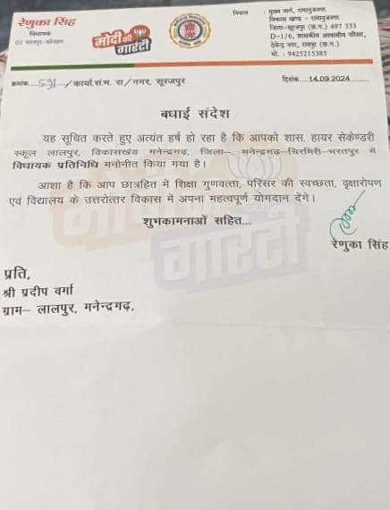 एमसीबी :- भरतपुर सोनहत विधायक रेणुका सिंह ने प्रदीप वर्मा को हायर सेकेण्डरी स्कूल लालापुर के लिए विधायक प्रतिनिधि मनोनित किया गया है प्रदीप वर्मा छात्रहित में करेंगे कार्य विद्यालय के विकास में अपना महत्वपूर्ण योगदान देंगे