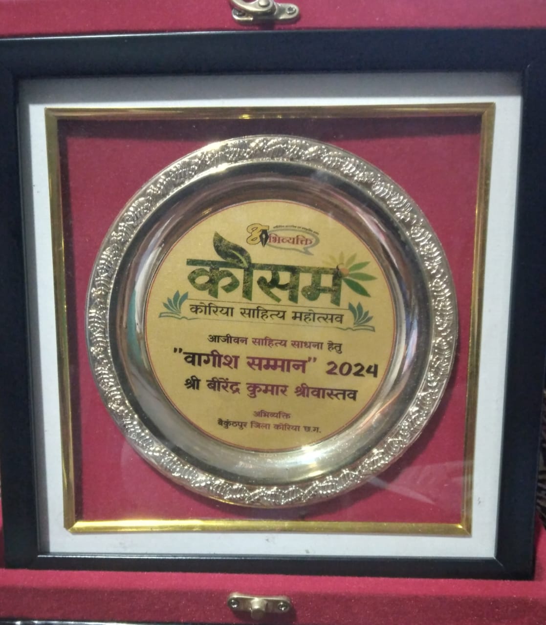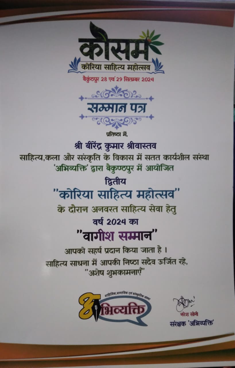 एमसीबी – मनेन्द्रगढ़, टीम अभिव्यक्ति बैकुंठपुर द्वारा आयोजित दो दिवसीय कोरिया साहित्य समारोह 2024 के मंच पर इस वर्ष का “बागीश साहित्य सम्मान” अंचल के वरिष्ठ साहित्यकार बीरेन्द्र कुमार श्रीवास्तव को दिया गया. टीम अभिव्यक्ति के संयोजक श्री रूद्र नारायण मिश्र ने बताया कि यह सम्मान वर्ष 2023 से प्रारंभ किया गया है जो सुधीर्घ साहित्य साधना में अनवरत सृजन कर्ता साहित्यकार जिसमें नए साहित्य सृजन कर्ताओं को आगे बढ़ाने एवं साहित्यकारों और साहित्य प्रेमियों की बीच चर्चित व्यक्तित्व को प्रदान किया जाता है.