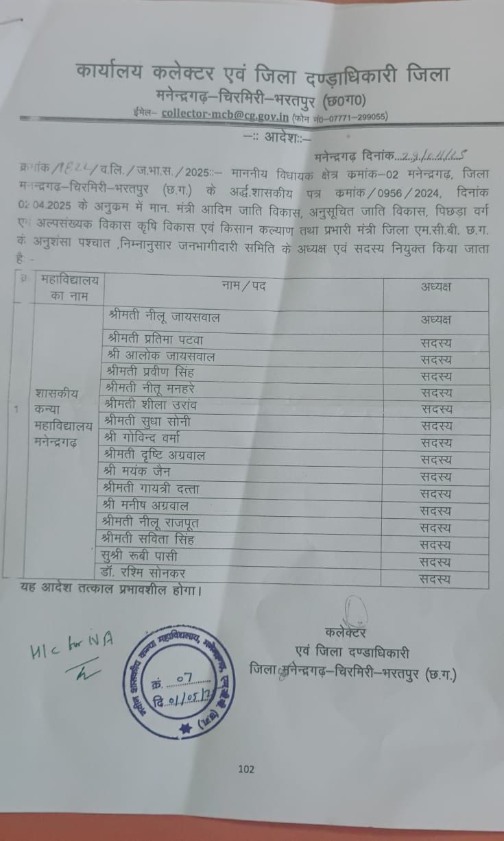 नीलू जायसवाल कन्या महाविद्यालय मनेन्द्रगढ़ की जनभागीदारी समिति की अध्यक्ष बनी