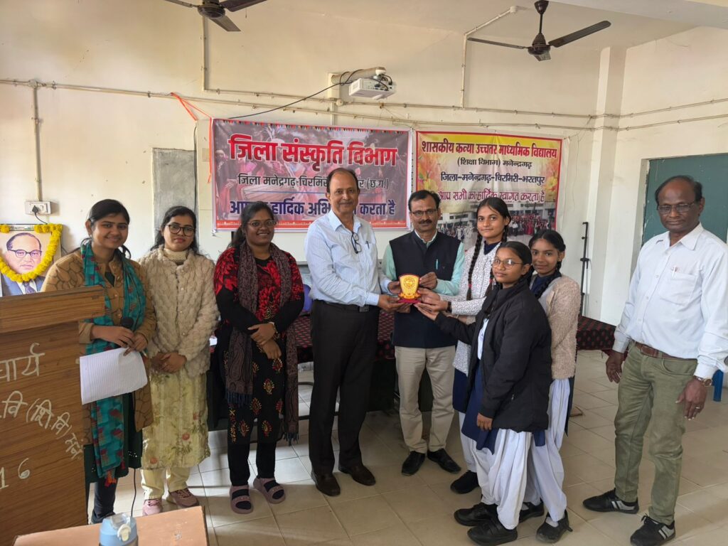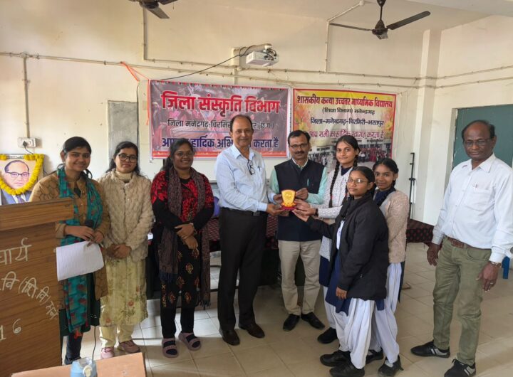 एमसीबी। जिला प्रशासन के निर्देशानुसार संस्कृति विभाग द्वारा शासकीय कन्या उच्चतर माध्यमिक विद्यालय मनेंद्रगढ़ में संविधान दिवस मनाया गया सर्वप्रथम अतिथियों द्वारा मां सरस्वती के छायाचित्र पर माल्यार्पण कर दीप प्रज्वलित किया गया तत्पश्चात संस्था के प्राचार्य द्वारा संविधान शपथ सभी को दिलाया गया इसके उपरांत अतिथियों ने संविधान के बारे में छात्राओ को संबोधित किया, कार्यक्रम में संविधान विशेषज्ञ एवं स्वतंत्रता संग्राम सेनानियों के ऑडियो /वीडियो के माध्यम से क्विज प्रतियोगिता का आयोजन किया गया जिसमें छात्राओं ने बढ़-चढ़कर हिस्सा लिया चयनित पांच टीमों ने भाग लिया जिसमें प्रथम स्थान खुशबू सिंह, निक्की सिंह व रागिनी यादव व द्वितीय स्थान चंचल कोरी रानू कुजूर व श्वेता तथा तृतीय स्थान वंदना सिंह, निधि यादव व विद्यावती की टीम ने प्राप्त किया सभी विजेता टीमों को संस्कृति विभाग के जिला नोडल अधिकारी डॉ विनोद पांडेय द्वारा पुरस्कृत किया गया तथा उनके उज्जवल भविष्य की कामना की गई। कार्यक्रम में प्रमुख रूप से संस्कृति विभाग के डॉ विनोद पांडे, प्राचार्य सत्येंद्र सिंह सहायक विकासखंड शिक्षा अधिकारी वीरेंद्र पांडे,अर्चना वैष्णव, विजय गोपाल राव, नारायण तिवारी के अलावा संस्था की शिक्षक दीपा देवांगन, संध्या मिश्रा, सुमित जायसवाल, प्रिया दुबे का सराहनीय योगदान रहा।