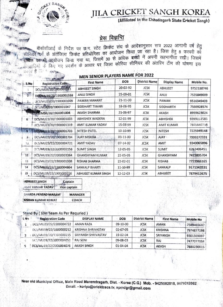 मनेंद्रगढ़::- बीसीसीआई के निर्देश पर छत्तीसगढ़ स्टेट क्रिकेट संघ के आदेशानुसार सत्र 2022 आगामी वर्ष के लिए सीनियर वर्ग के अंतजिला क्रिकेट प्रतियोगिता का आयोजन किया जा रहा है, जिस के लिए 8 फरवरी को आमाखेरवा ग्राउंड में ट्रायल का आयोजन किया गया था जिसमें 30 से अधिक बच्चो ने सहभागिता रखी। इसमें खिलाड़ियों के किए गए प्रदर्शन के आधार पर जिला कोरिया सीनियर का अंतरिम टीम का घोषणा किया गया अभिजीत सिंह, अनुज सिंह, पवन महंत, सिद्धार्थ तिवारी, अकाश शर्मा, अभिषेक बढेरा, अमित कुमार यादव, नितेश पटेल, अजय मिश्रा, अमित यादव, सुमित सिंह, घनश्याम कुमार, ऋषभ शर्मा, संकल्प भारती और अभिषेक कुमार सिंह खिलाड़ियों का चयन किया गया, वही पांच खिलाड़ियों को स्टैंड वाई में रखा गया है। जिसमें अमन रजा, कृष्णा श्रीवास्तव, प्रियांश श्रीवास्तव, राज सोनी,और आकाश सिंह का नाम है चयन हुए खिलाड़ी मनेंद्रगढ़ से 13 तारीख को रवाना होंगे रायपुर में तीन मैच खेलेंगे टीम का चयन विनोद जयसवाल ,नरेंद्र सिंह रैना की निगरानी में किया गया टीम के साथ शारदा मरावी और किशन केवट रहेंगे सभी चयनित खिलाड़ियों को संघ के अध्यक्ष श्री संजय पोद्दार और जिला क्रिकेट संघ के समस्त सदस्यों ने बधाई देते हुए शुभकामनाएं दी है।
